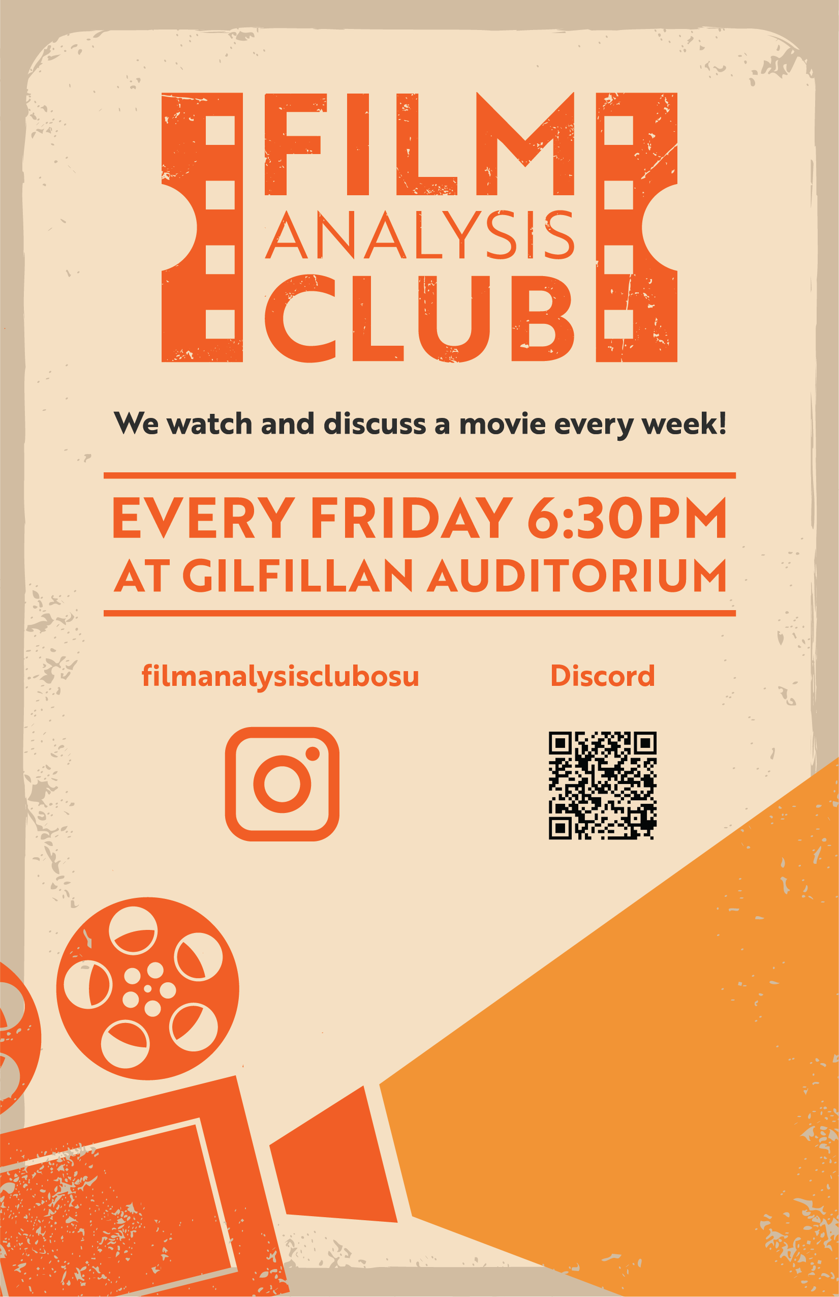 Branding for the Oregon State University Film Analysis Club. The club was small and needed a brand identity to help advertise to students. Originally, we went with a weathered, retro look, using OSU's signature orange to tie the club in with the college. Deliverables included a logo, a poster, a flyers, buttons, weekly announcement posts for social media, QR code cards, a 3'x2' banner and a film camera centerpiece constructed using cardboard and sharpie. The rebrand embraced a bit more color and went with a more fun and angular style. It dropped the weathered texture that was prominent in the old branding. Deliverables, so far, have been a new logo, poster, banner, and social media posts.